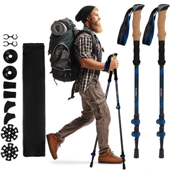 Produkt : Dieses 2er-Pack tragbarer Trekkingstöcke zeichnet sich durch seine leichte Konstruktion, die verstellbare Höhe, die Griffe aus EVA-Kork und die robusten Spitzen aus und bietet zuverlässigen Halt beim Klettern, Wandern und auf anspruchsvollen Trail-Abenteuern im Freien.