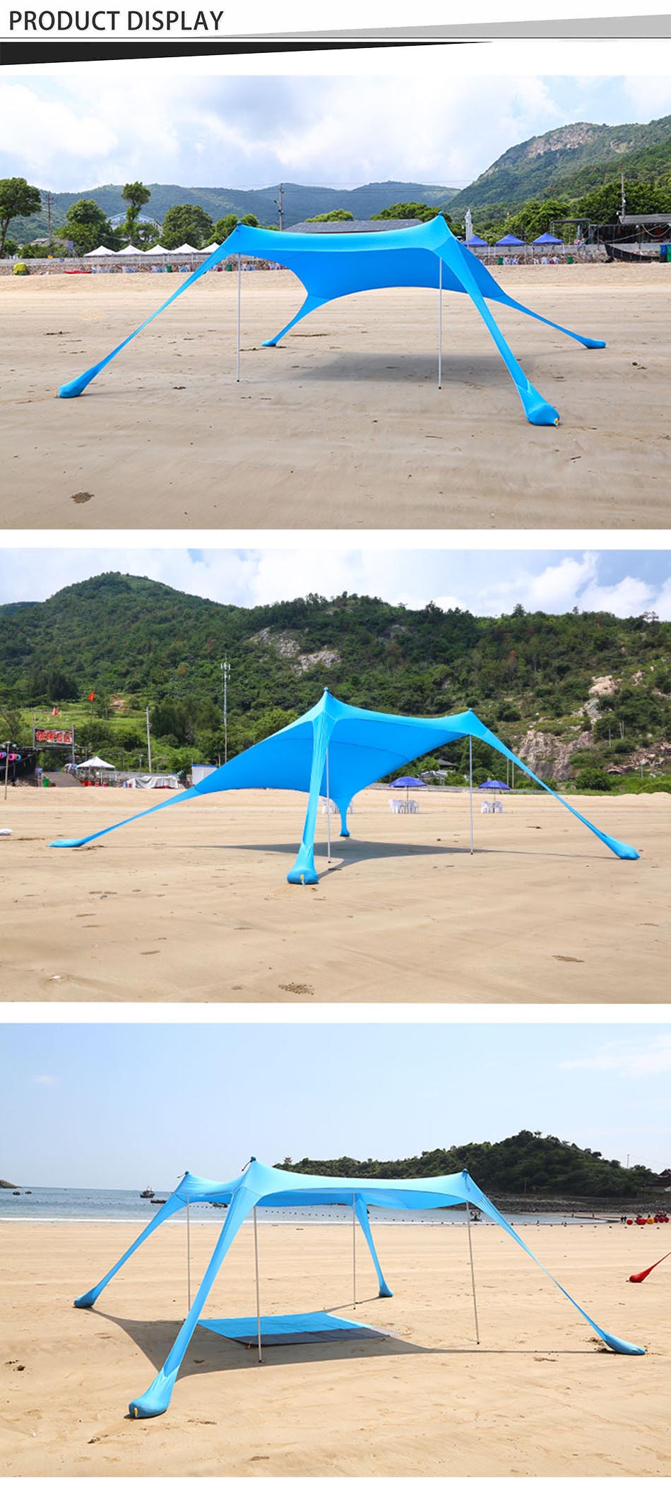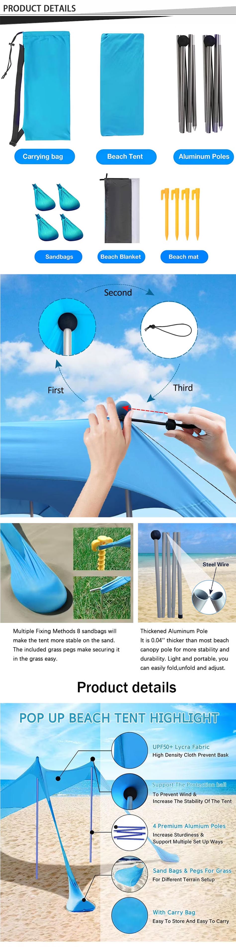 Produkt : Diese Aluminiumstangen Camping Canopy Markisen bieten einen haltbaren Sonnenschutzschutz mit einem Strandzeltdesign mit Sandbag -Anker für Stabilität, perfekt für Camping im Freien, Picknicks und Strandreisen.