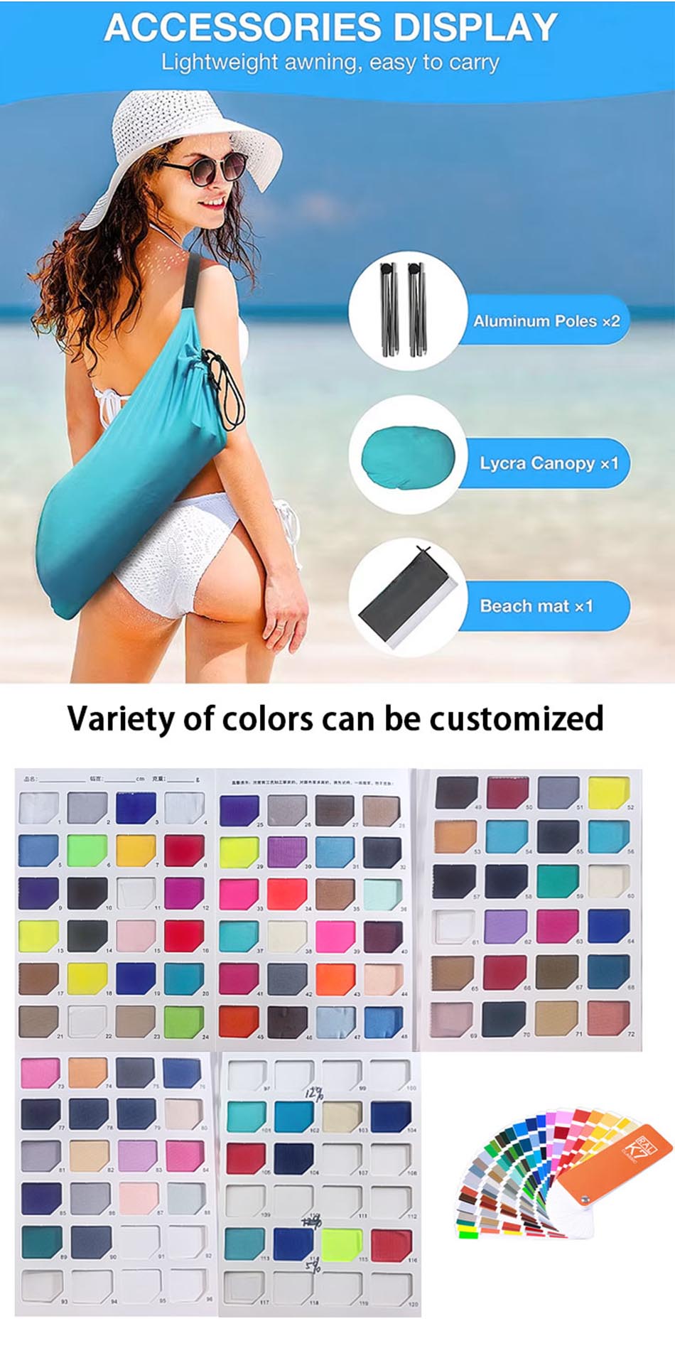 Es besteht aus hochwertigen Aluminiumstangen und bietet einen leichten, aber robusten Rahmen, der Stabilität und Langlebigkeit gewährleistet. Der Sonnenschutz -Baldachin bietet einen hervorragenden UV -Schutz und schützt Benutzer vor schädlicher Sonneneinstrahlung.