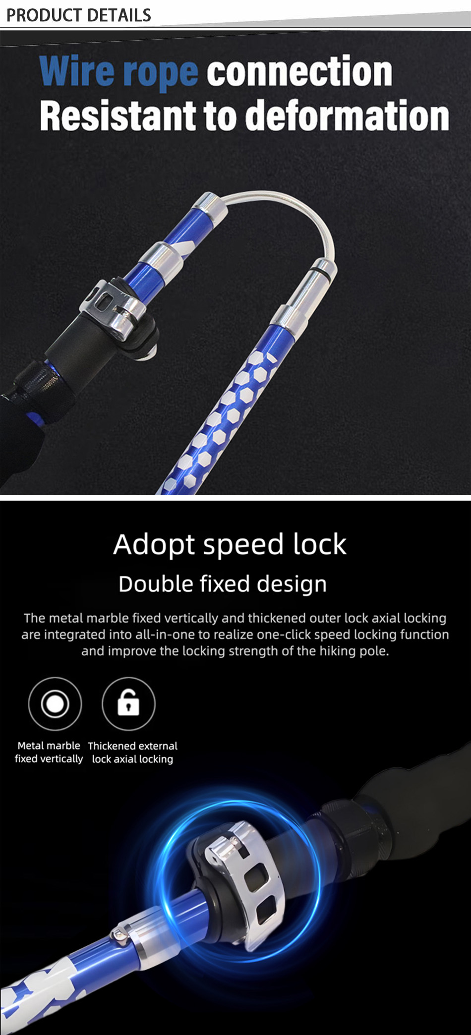 Dieser Trekkingstock verfügt über ein Kombinationsschlosssystem und ist mit einem Schnellverschluss und einem Drehverschluss ausgestattet. Im Bereich des Drehverschlusses ist eine Anti-Schock-Feder eingebaut, so dass Sie weniger Schäden erleiden. Sie können sich immer schneller bewegen und dabei Energie verbrauchen.