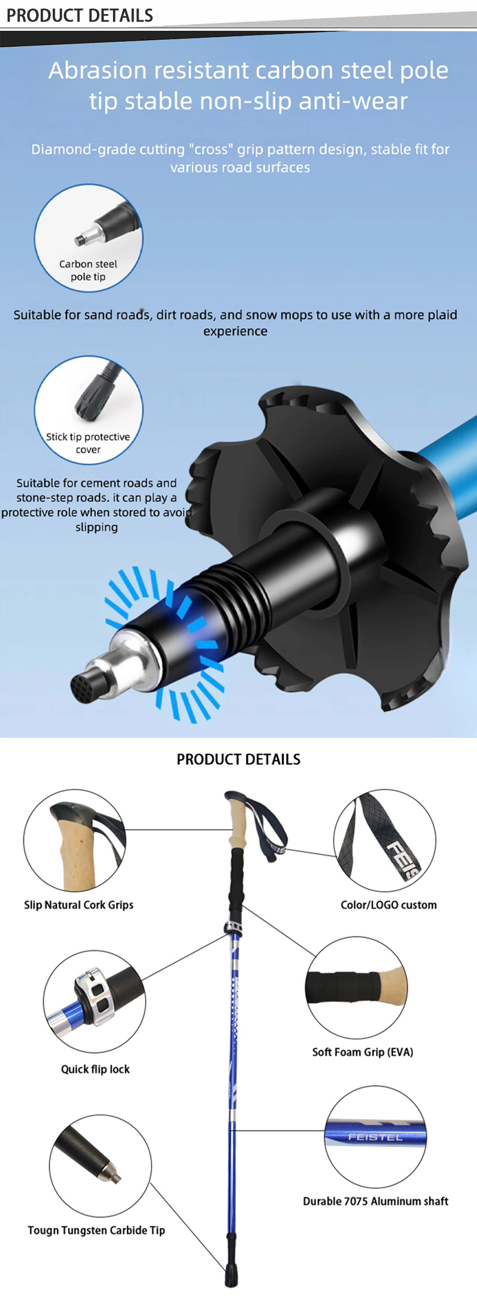Marke : ANHUI FEISTELFABRIK Relate Manufacturing : OEM & ODM Produkt : Die ultraleichten, multifunktionalen, faltbaren Wanderstöcke aus Aluminium 7075 zeichnen sich durch eine robuste Konstruktion, komfortable EVA-Griffe und kompakte Transportierbarkeit aus und bieten zuverlässige Unterstützung beim Wandern, Klettern, Trekking und bei alltäglichen Spaziergängen.