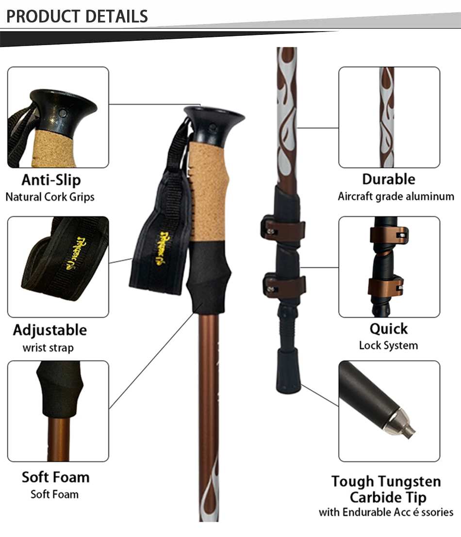 Marke: ANHUI FEISTEL FACTORY Beziehung zur Fertigung: OEM & ODM Produkt: Leichter Teleskop-Trekkingstock aus 6013-Aluminium: schnell verstellbare Schlösser, langlebig, vielseitig, ergonomisch, leicht, ideal zum Wandern, anpassbare Länge, stabil.