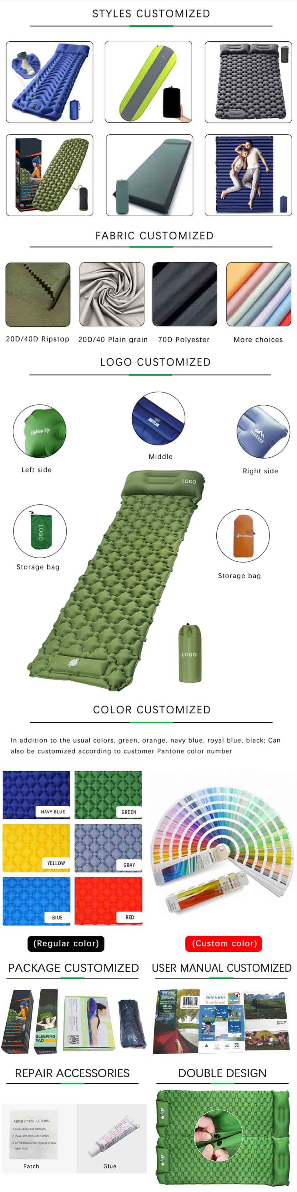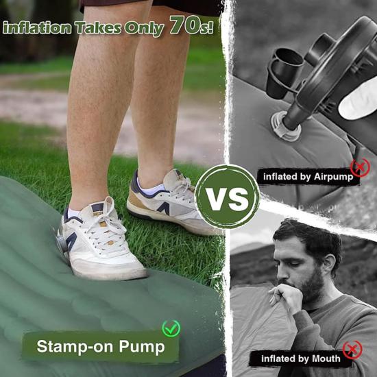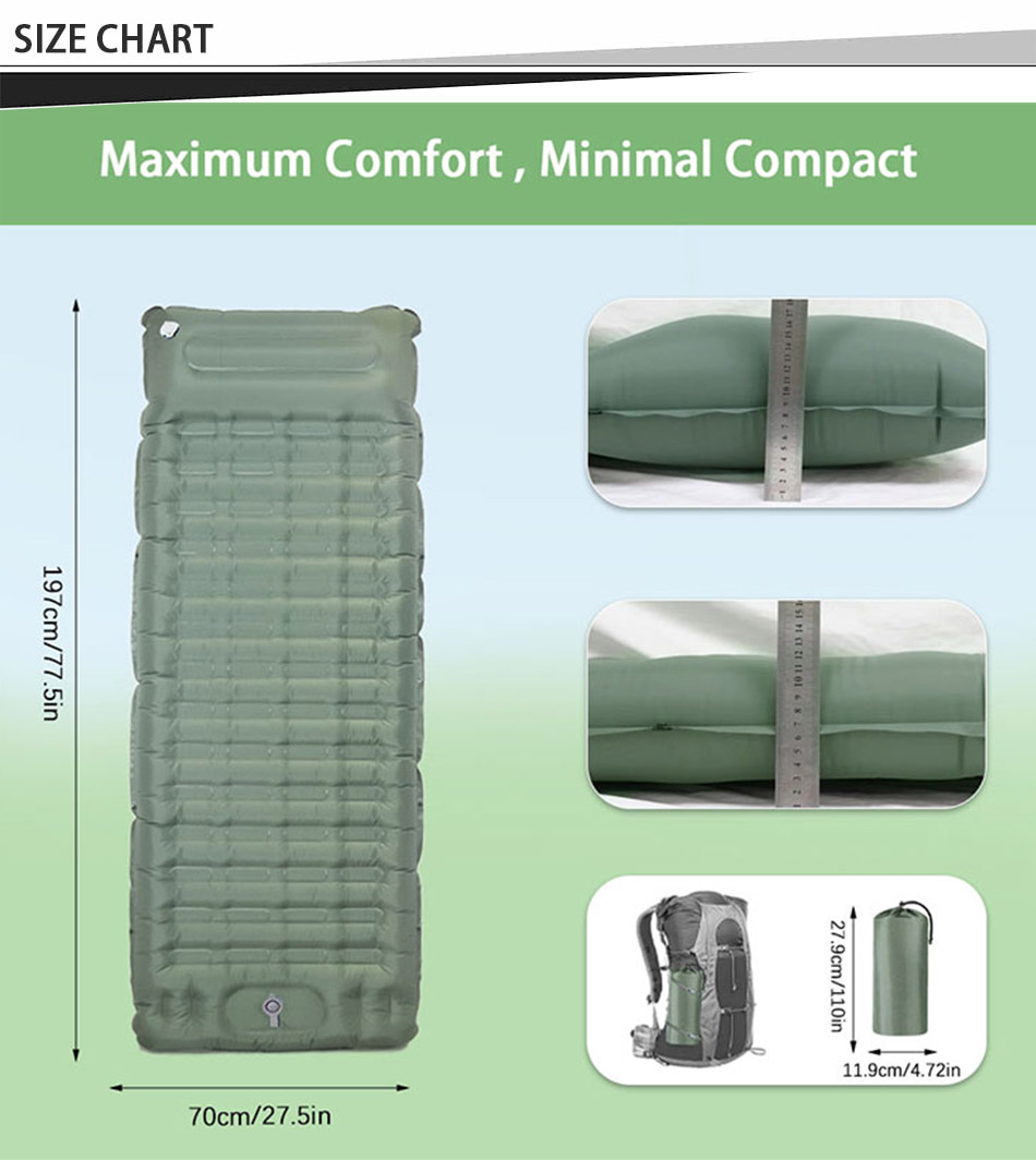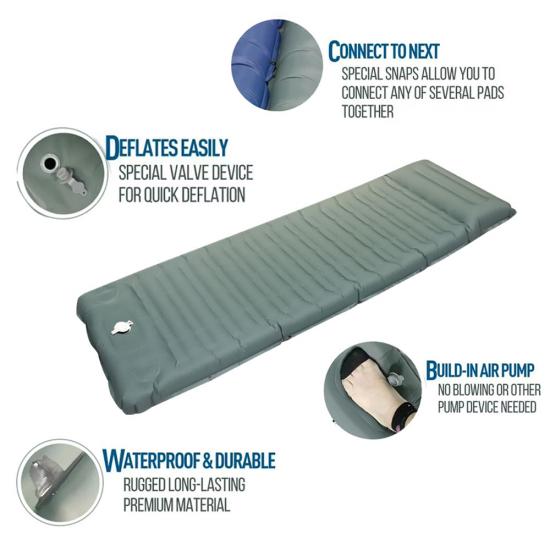 Automatische aufblasbare Campingmatten im Freien sind eine sehr praktische Outdoor-Ausrüstung. Es besteht aus dem Material Chunya Textile und ist mit PVC beschichtet, das sich durch hohe Elastizität, Komfort und Verschleißfestigkeit auszeichnet.