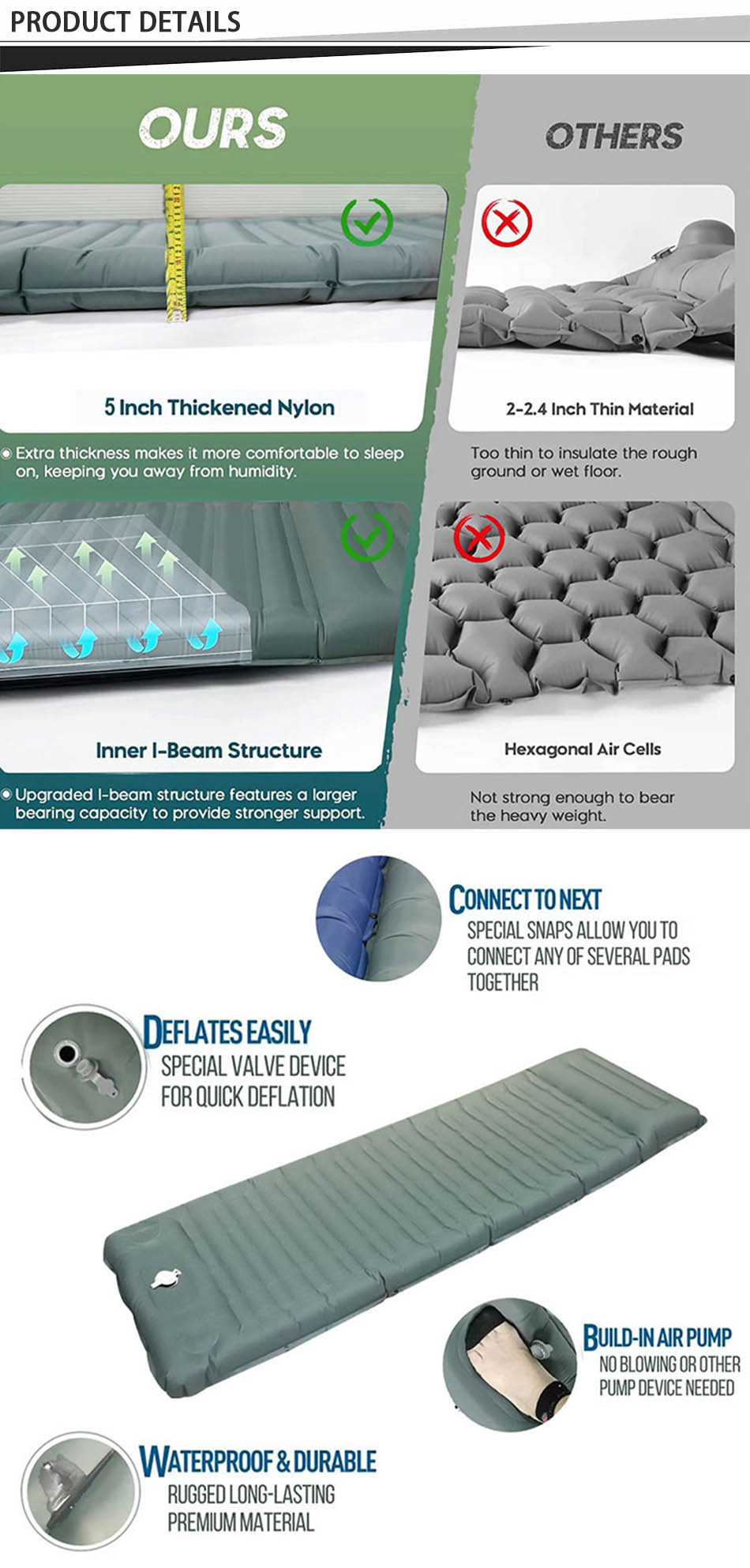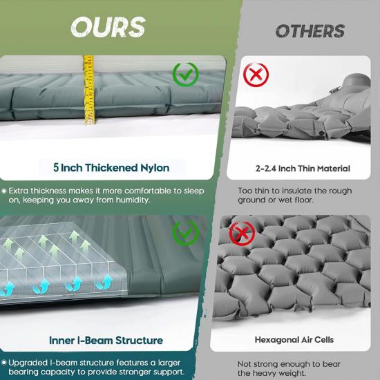 1.aus strapazierfähigem und hochwertigem Material - 40D Nylon Campingmatte für draußen. 2. dauerhaft 2'' dicke Isomatte mit ausgezeichneter Verschleißfestigkeit.