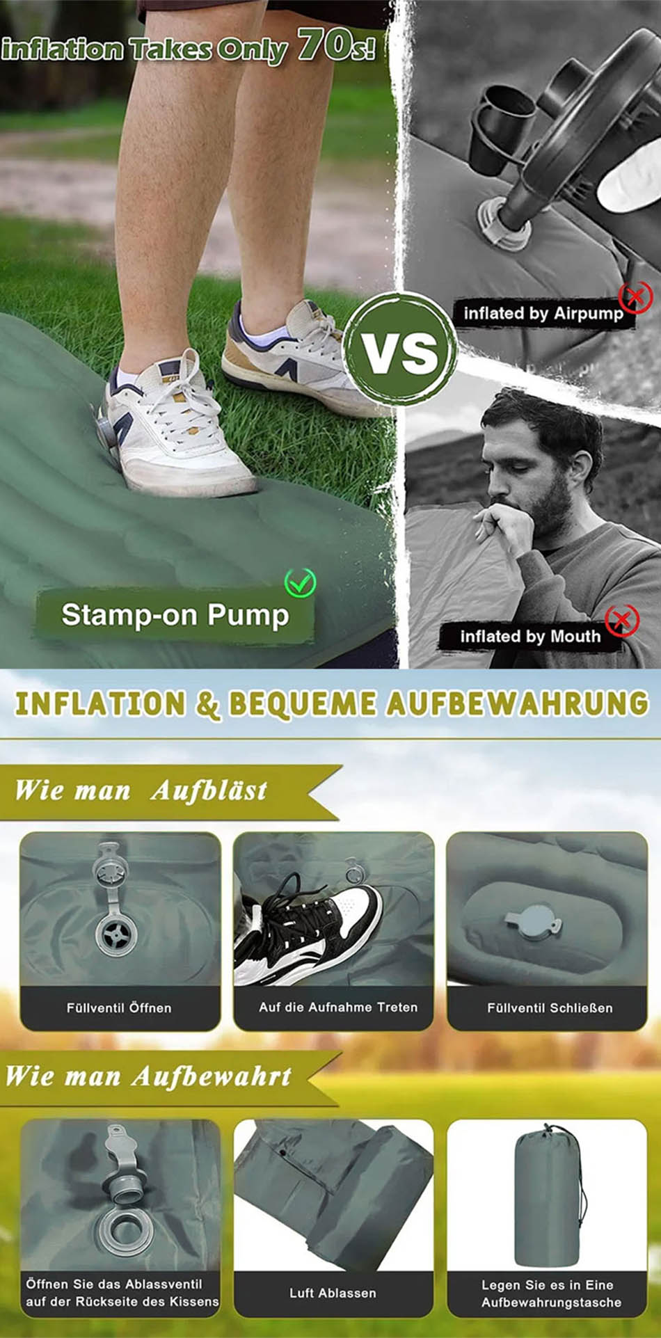 Produkt : Diese leichte aufblasbare Campingmatte bietet Komfort und Halt für Outdoor-Abenteuer und ist damit die perfekte Reise-Isomatte für Wanderungen, Camping- oder Rucksackreisen.