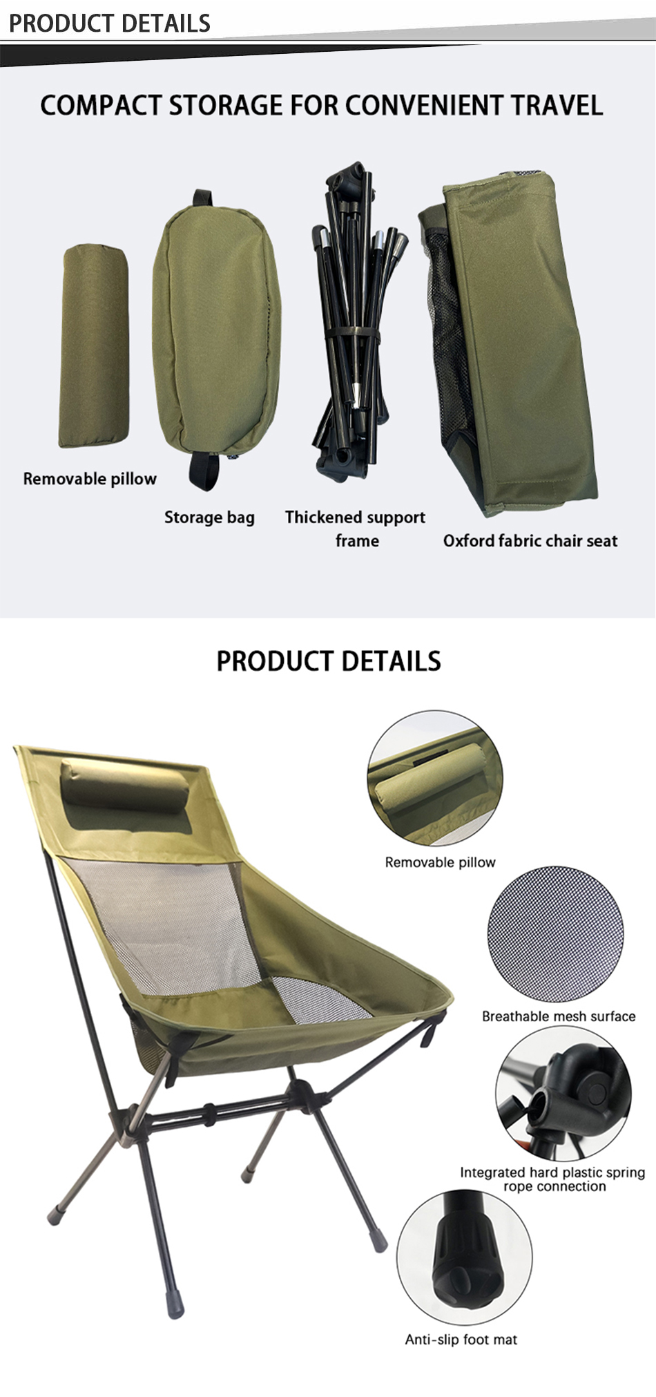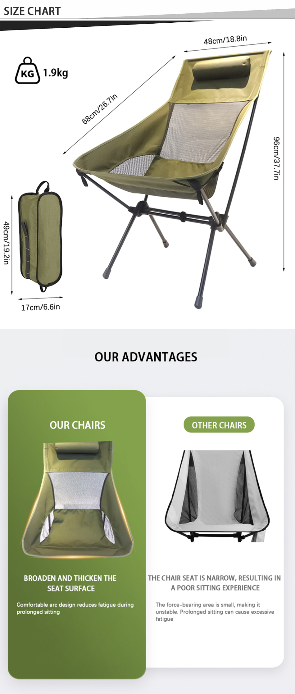 Marke : ANHUI FEISTEL FACTORY Zugehörige Fertigung : OEM und ODM Produkt : Ultraleichter Campingstuhl mit hoher Rückenlehne und Tragetasche, perfekt für Outdoor-Abenteuer, bietet Komfort, Haltbarkeit und einfache Tragbarkeit.