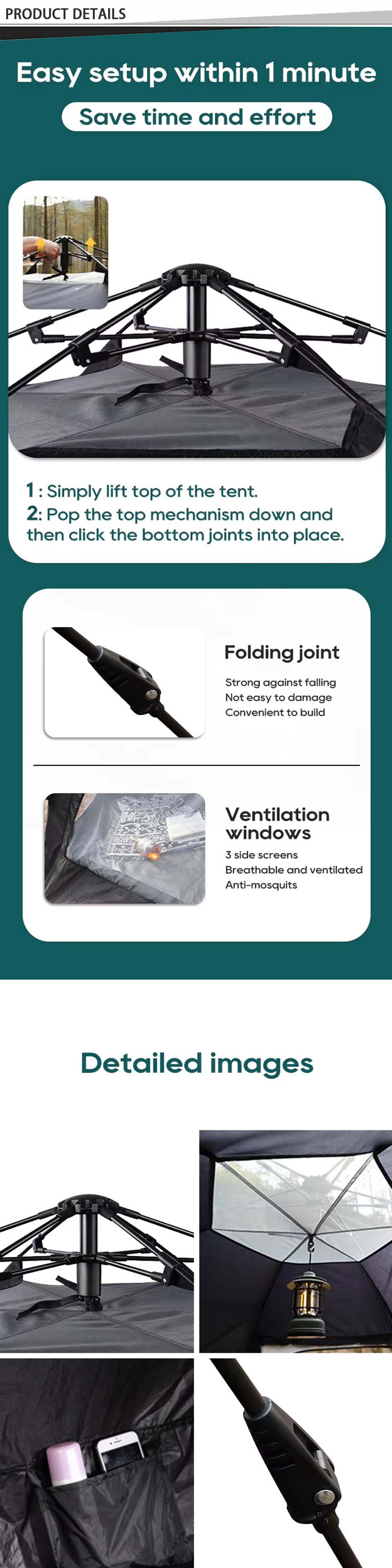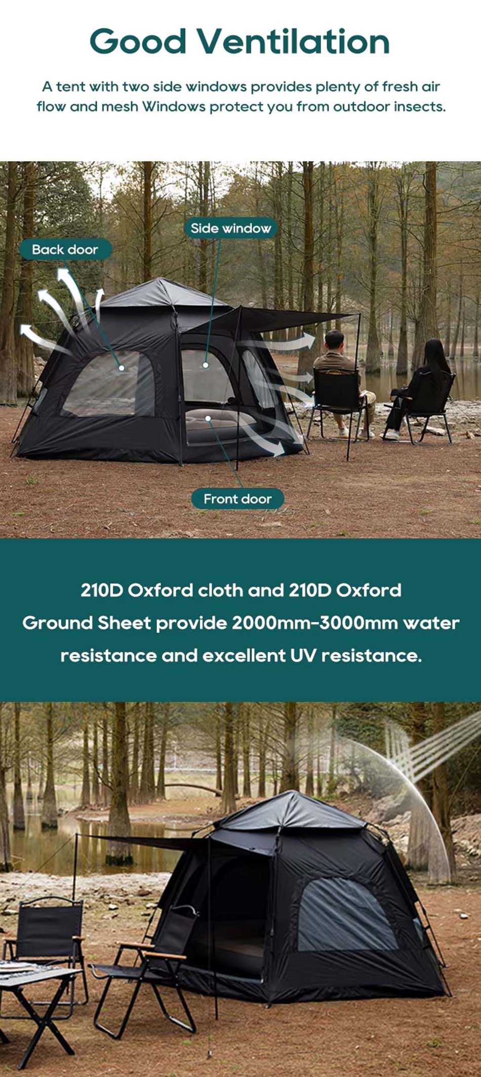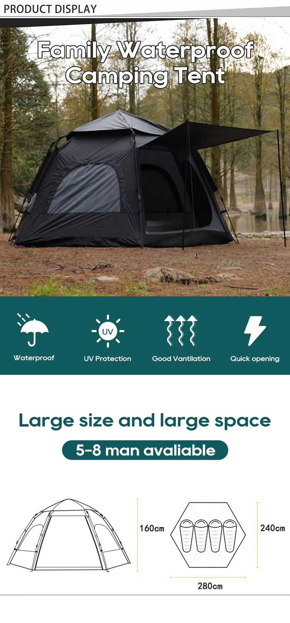 Mit einem automatischen Pop-up-Design wird innerhalb von Sekunden angezeigt, wodurch der Ärger der traditionellen Zeltbaugruppe beseitigt wird. Es besteht aus hochwertigem UV-resistenten Stoff und bietet einen hervorragenden Sonnenschutz und gewährleistet gleichzeitig die Belüftung durch Netzfenster für den Luftstrom.