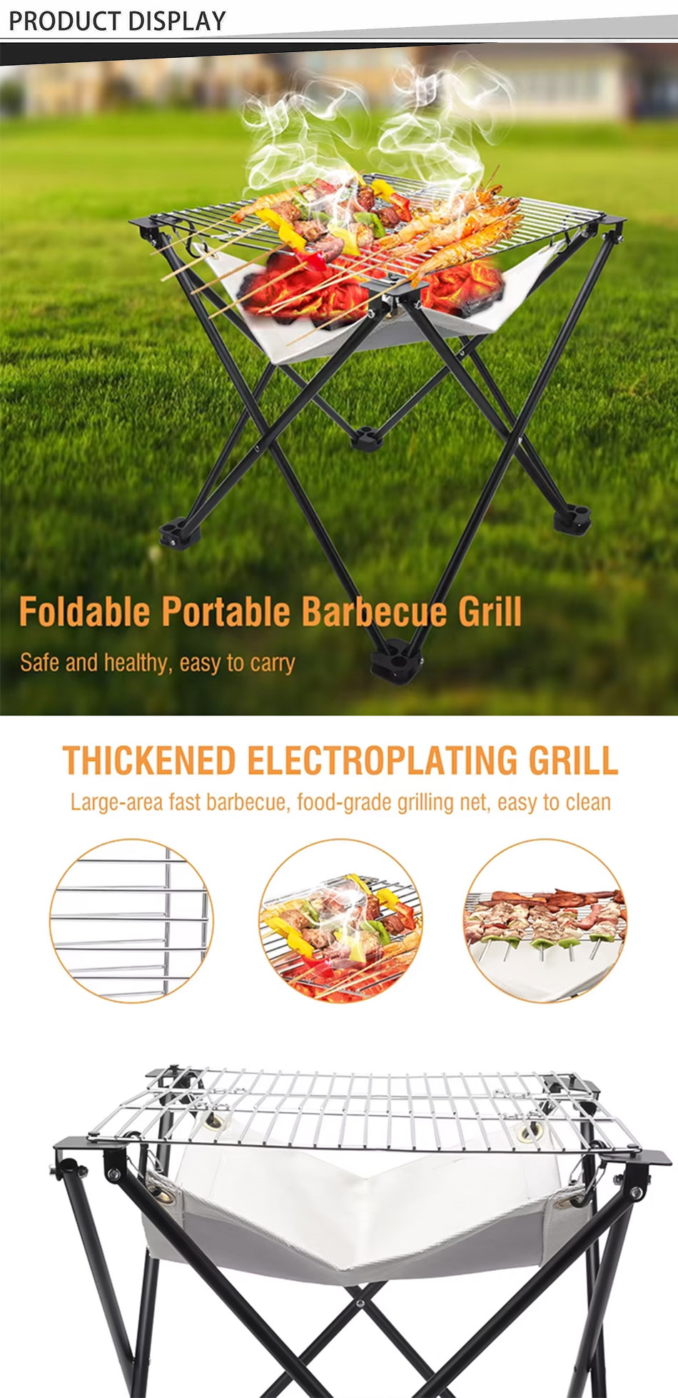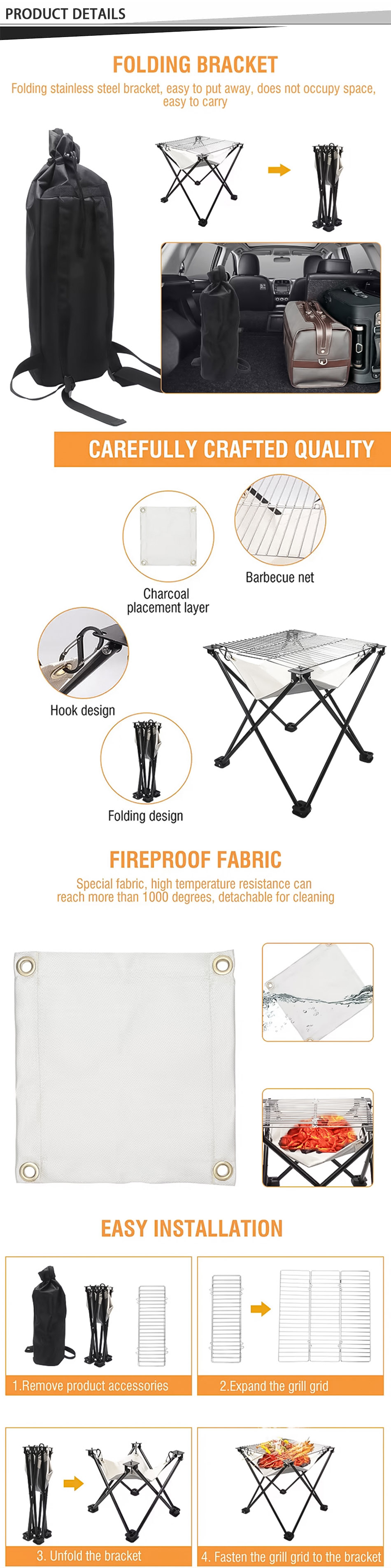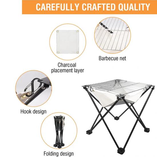 Produkt : Dieser tragbare Faltgrill im Freien verfügt über ein feuerfestes Tuch, einen Edelstahlrahmen und ein kompaktes Design, wodurch es haltbar, leicht, hitzebeständig und perfekt für BBQ-Picknicks ist.