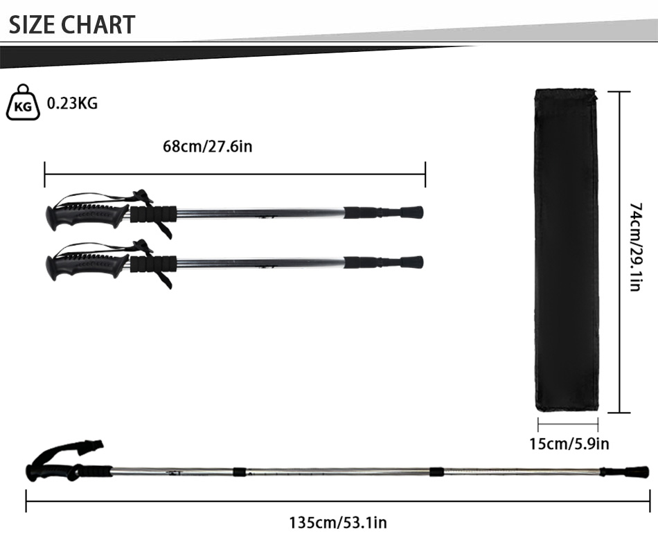 Diese teleskopierbaren Wanderstöcke aus Aluminiumlegierung bieten zuverlässigen Halt, Komfort und sind ideal für Wanderungen, Trekkingtouren und alltägliche Outdoor-Aktivitäten. Hergestellt aus einer leichten und dennoch robusten Aluminiumlegierung, reduzieren diese Stöcke die Ermüdung und bieten gleichzeitig hervorragende Stabilität und Festigkeit auf unterschiedlichem Terrain. Dank des Teleskopdesigns lässt sich die Höhe einfach an verschiedene Nutzer und Geländebedingungen anpassen, während der zuverlässige Innenverschluss die Länge während der Benutzung sicher fixiert. Ein komfortabler Gummigriff sorgt für festen, rutschfesten Halt, verbessert die Kontrolle und reduziert die Belastung der Hände bei längeren Wanderungen. Zusammengeklappt sind die Wanderstöcke kompakt und leicht zu transportieren und eignen sich daher ideal für Reisen, Fitness-Walking und Outdoor-Aktivitäten. Sie sind sowohl für Anfänger als auch für Fortgeschrittene geeignet und bieten die perfekte Balance aus Leistung, Langlebigkeit und Benutzerfreundlichkeit für einen aktiven Lebensstil.
