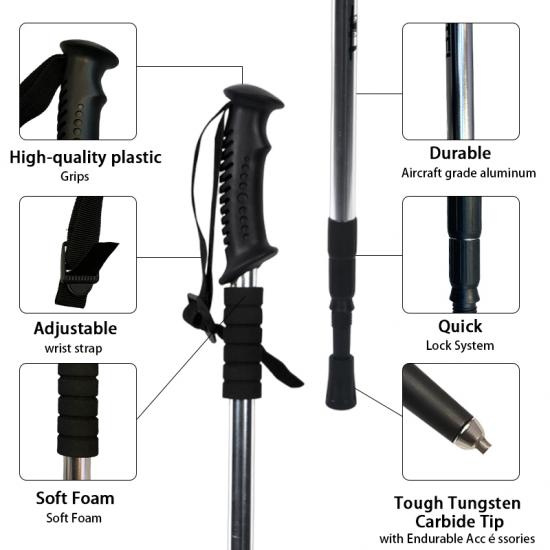 Produkt : Die teleskopierbaren Outdoor-Wanderstöcke aus Aluminiumlegierung zeichnen sich durch ein leichtes Design, ein robustes inneres Verriegelungssystem und einen komfortablen Gummigriff aus und bieten zuverlässigen Halt beim Wandern, Trekking und alltäglichen Spaziergängen im Freien.