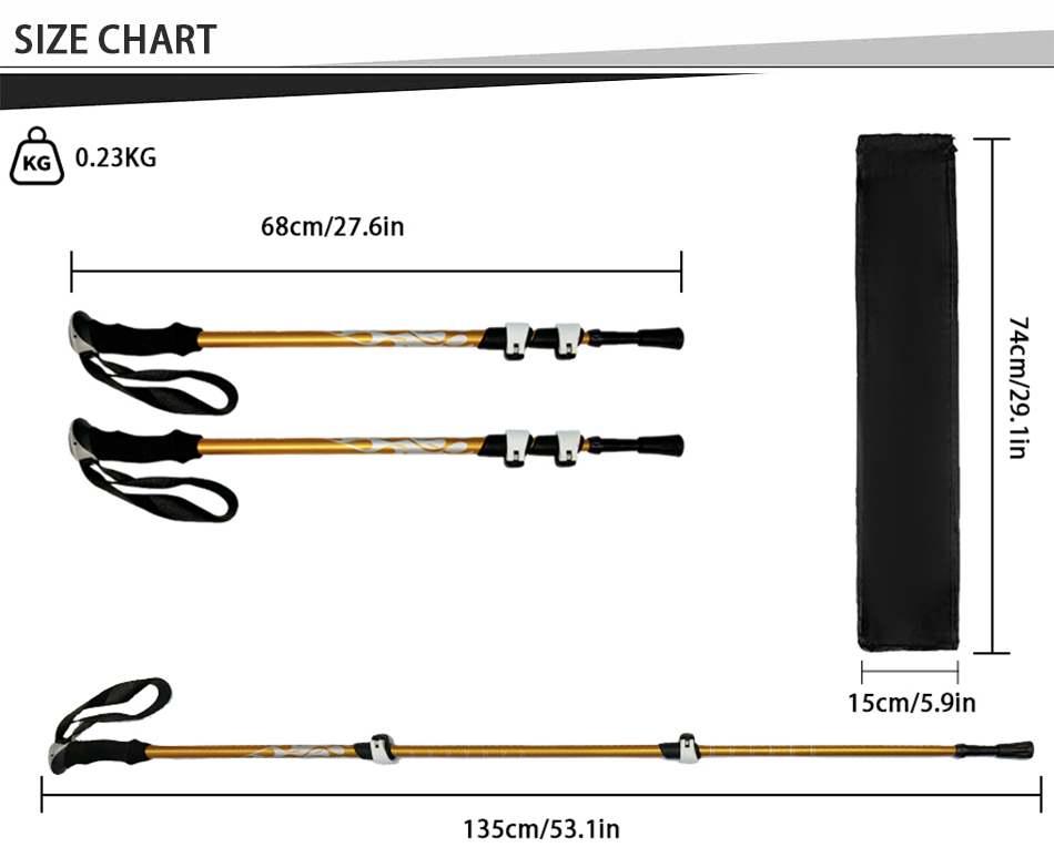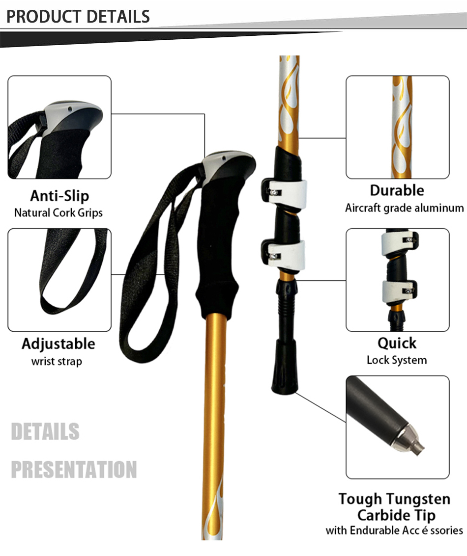 Produkt : Der ultraleichte Nordic-Trekkingstock für den Outdoor-Bereich kombiniert 7075 Aluminium und Kohlefaser mit Griffen aus Kork und EVA und bietet starke Unterstützung, einfaches Zusammenklappen und zuverlässige Leistung beim Wandern.