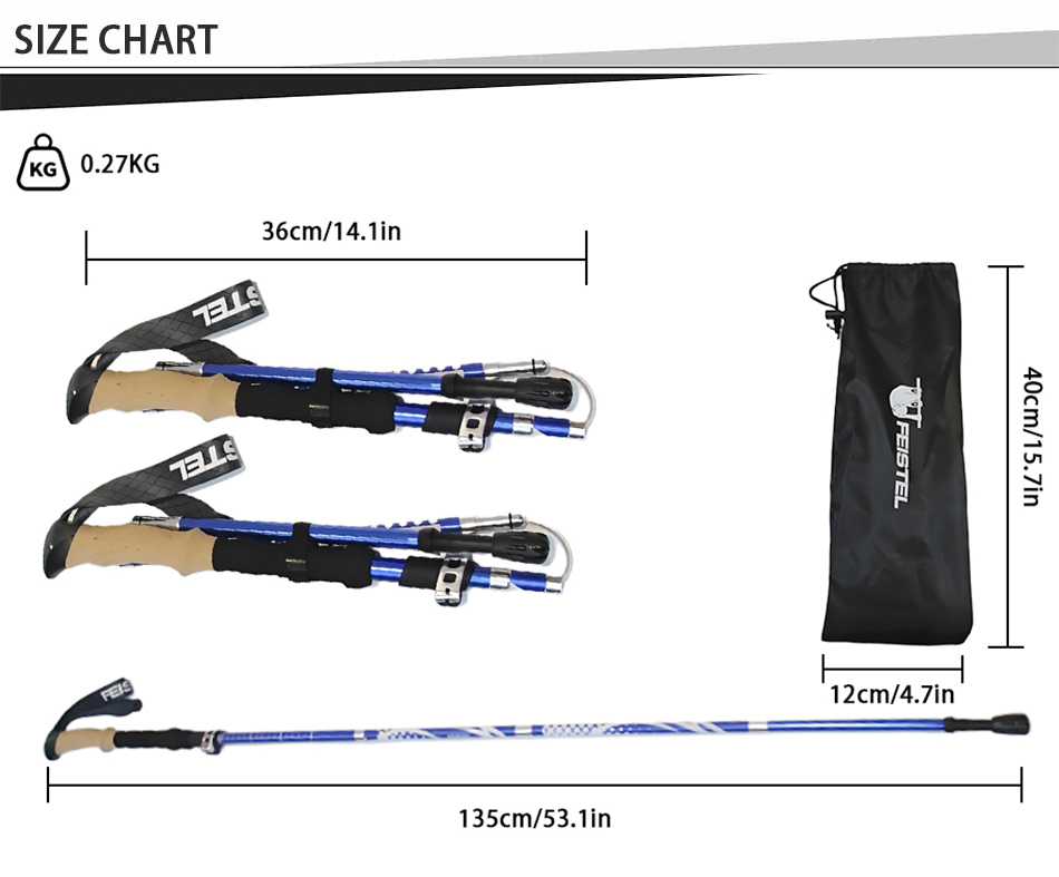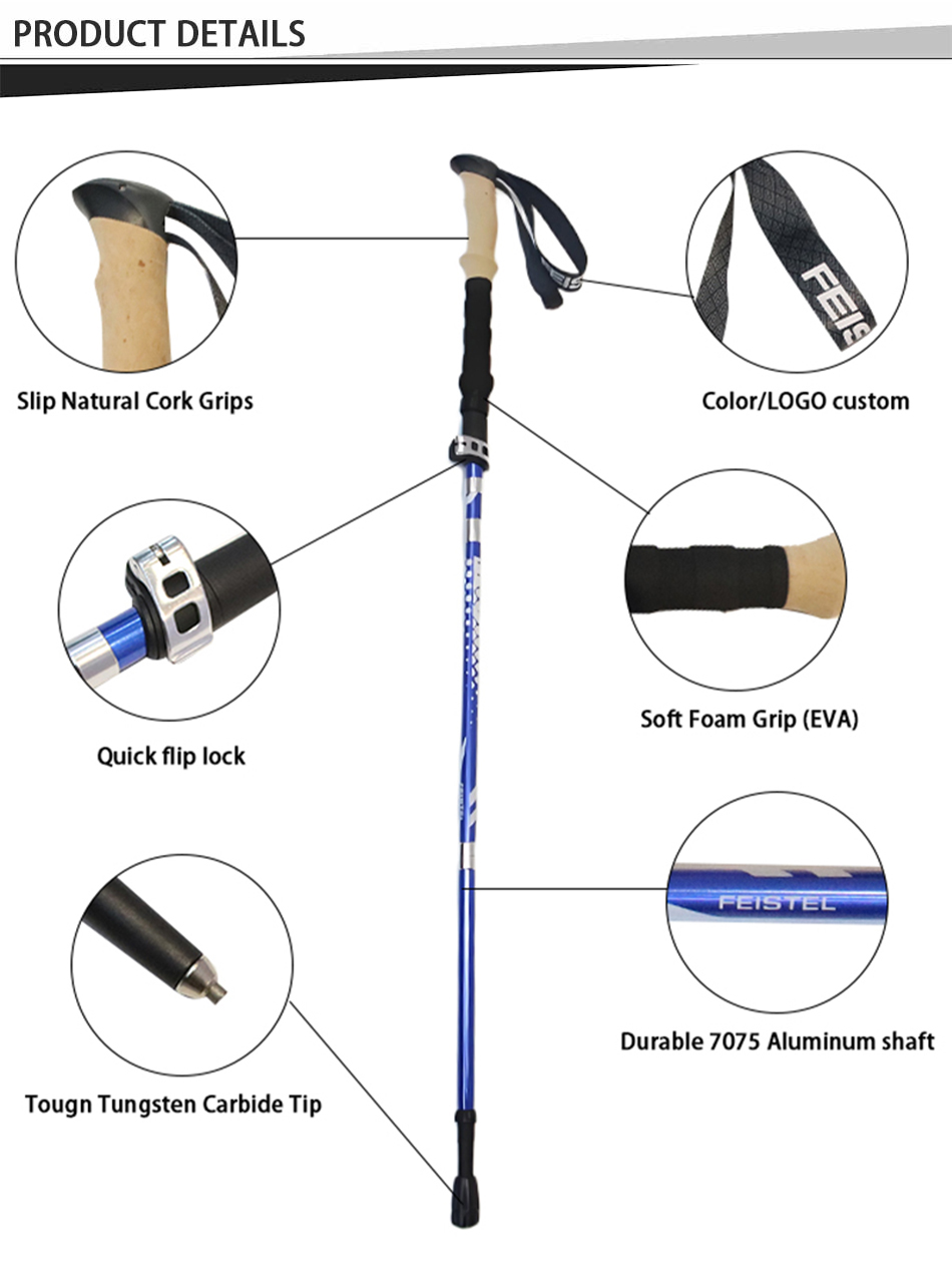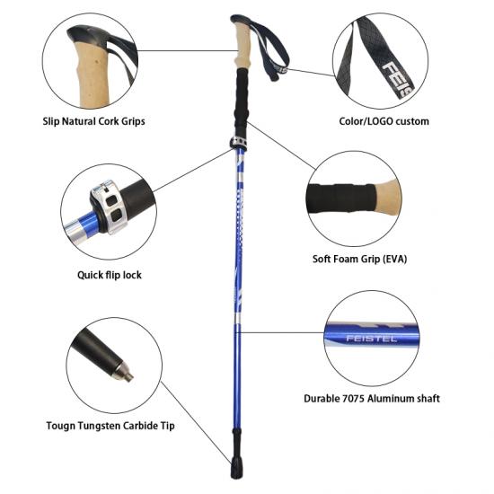 Marke : ANHUI FEISTELFABRIK Relate Manufacturing : OEM & ODM Produkt : Die ultraleichten, multifunktionalen, faltbaren Wanderstöcke aus Aluminium 7075 zeichnen sich durch eine robuste Konstruktion, komfortable EVA-Griffe und kompakte Transportierbarkeit aus und bieten zuverlässige Unterstützung beim Wandern, Klettern, Trekking und bei alltäglichen Spaziergängen.